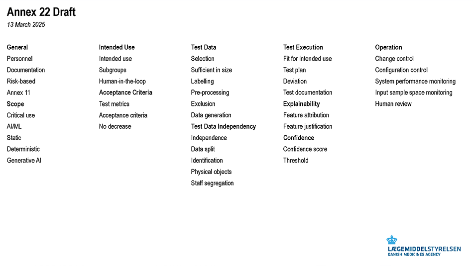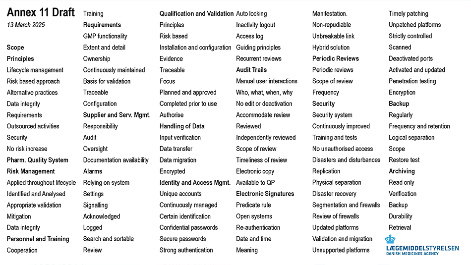 Another highlight was the double presentation by Ib Alstrup, a Danish inspector who is leading the Annex 11 revision and the redrafting of Annex 22 on artificial intelligence. His discussion partner was Dr Wolfgang Schumacher, head of the ECA IT group. Ib emphasized that the draft document for both annexes has been agreed upon with the group of inspectors involved and is now with the EU Commission. The Commission is currently reviewing the document from a legal perspective. Publication is scheduled for September 2025. At the beginning of his presentation, he showed that there are IT security re-quirements in all GxP areas (GLP, GCP, GMP, GVP). He then gave an overview of the contents of the draft document Annex 11 Revision and Annex 22 Draft, see Figures 3 and 4 on p. 20.
