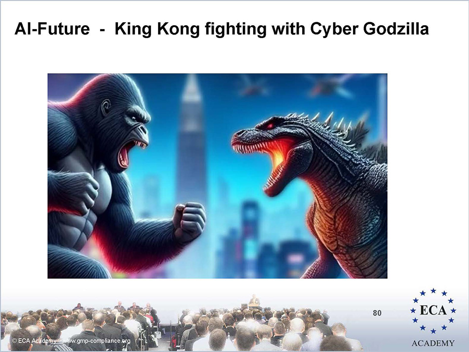 In his customarily critical manner, Dr Wolfgang Schumacher then responded on the basis of the concept paper on the Annex 11 revision and the overview that is currently known about Annex 22. His presentation was titled "Pain Points and Industry Expectations." He began his presentation with a statement about general expectations of new regulations: "Validation should become easier and faster." "There should be a recipe for validation." He then used comparisons between the current Annex 11 and the contents of the concept paper to show that this will not be the case. And the use of artificial intelligence? Here, Wolfgang Schumacher saw "King Kong fighting Cyber Godzilla" (Figure 5 on p. 20). His industry perspective in particular was shared by the audience on several occasions.