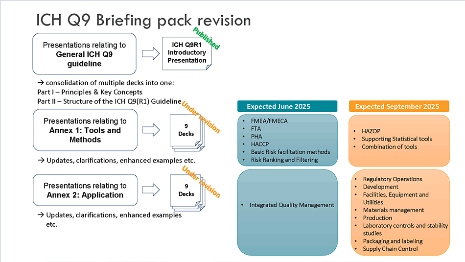 He then discussed the most significant changes compared to the previous version of ICH Q9 and used the new training slides to illustrate how to deal with: