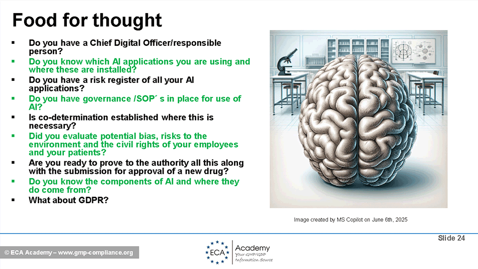 Dr Jörg Stüben from Boehringer Ingelheim opened the second day. He spoke about "Artificial Intelligence and Digitalization in Pharma." Dr Stüben engaged the participants at the beginning with Slido polls. He then presented different types of artificial intelligence and various guidelines (specific vs. non-specific). He expressed his regret that the upcoming Annex 22 on artificial intelligence excludes "large language models" and "generative AI." Ib Alstrup, head of the group drafting Annex 22, responded that this would be a first draft and could be further developed. Again using Slido polls, he then asked the audience to vote on the use of artificial intelligence in various cases in research, drug safety, IPC, and batch release. Finally, he gave the audience some "food for thought" (see Figure 7 on p. 21).